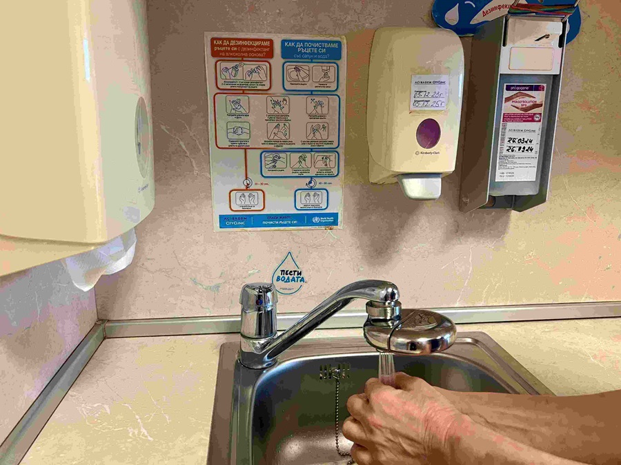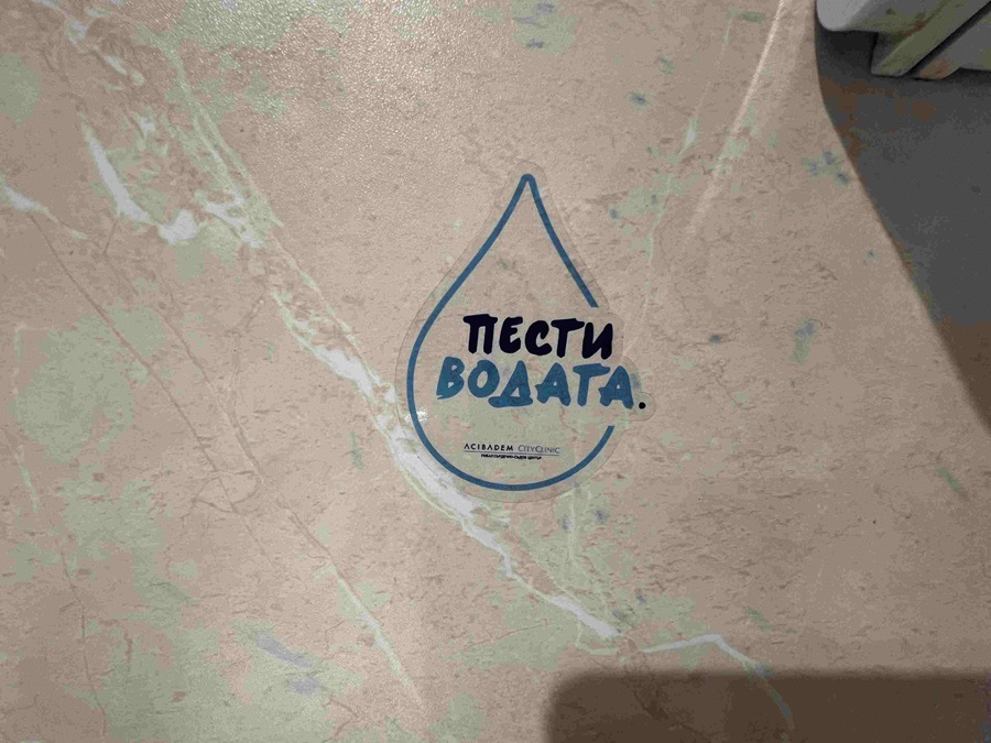 Първата е посветена на важността от спазването на добра лична хигиена на ръцете. За целта поставихме основните послания на Световната здравна организация по темата на ключови места в болницата. На второ място оставихме своя призив за пестене на водата по време на сапунисване на ръцете при всяка от близо 130-те мивки в лечебното заведение. Зад стикерите „Пести водата“ стои фактът, че дори само половин минута прекомерно изтичане на вода може да доведе до загуба на десетки литри на дневна база.