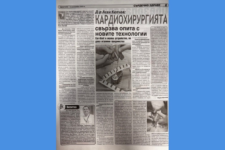 - Cor-Knot въведохме за пръв път през 2019 г. в рамките на програмата ни за минимално инвазивна хирургия. Скоро след това, впечатлени от множеството му предимства, започнахме да го използваме рутинно и при комплексни сърдечни операции, извън минимално инвазивния подход – при почти всички пациенти, нуждаещи се от аортно клапно протезиране, както и при високорискови случаи в конвенционалната хирургия. Устройството гарантира максимална безопасност, намалявайки значително риска от ранен протезен ендокардит. То улеснява имплантирането на иновативни биологични клапни протези, като осигурява максимално сигурна фиксация за клапния пръстен. Това оптимизира техниката ни и ни прави по-ефективни, а пациентите – по-защитени.