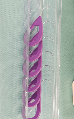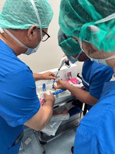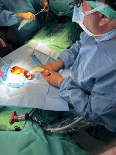 Cor-Knot® представлява автоматизирана система за лигиране и рязане на хирургични конци, използваща титаниеви скоби за сигурна фиксация на клапни протези и рингове. Устройството елиминира субективността и вариабилността, характерни за ръчното завързване на възли, като осигурява стандартна сила на задържане, намалява времето за имплантация и води до значителна редукция на аортното клампажно време и продължителността на кардиопулмоналния байпас. Това е особено важно при пациенти с повишен хирургичен риск или съпътстващи заболявания. Cor-Knot® намира широко приложение при минимално инвазивната и ендоскопска хирургия, където пространствените ограничения правят мануалната техника трудоемка и потенциално субоптимална. От особено клинично значение е връзката между използването на Cor-Knot® и намаления риск от протезен ендокардит. Публикувани данни (Lee et al., Innovations, 2014; Kahrovic et al., Front Cardiovasc Med, 2024) показват, че титаниевите скоби, за разлика от шевни възли, не задържат биологичен материал и не създават допълнителни ниши за бактериално колонизиране, което предполага по-ниска склонност към инфекциозни усложнения. Устройството е въведено в България от екипа на Аджибадем Сити Клиник през 2019г, като към момента се използва при голяма част от пациентите с минимално инвазивна и ендоскопска хирургия, както и при конвенционална хирургия при комплицирани пациенти за скъсяване времето на операцията. (Фиг. 9)