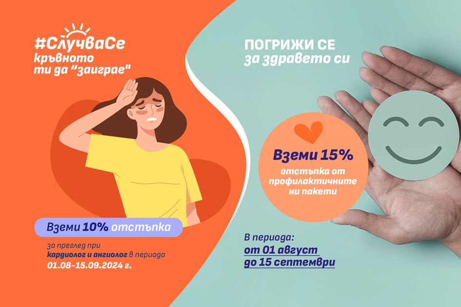 От 1 август до 15 септември включително всички видове Пакети профилактика в Аджибадем Сити Клиник УМБАЛ Сърдечно-съдов център идват с 15% отстъпка, а прегледите при нашите кардиолози и ангиолози – с 10%.