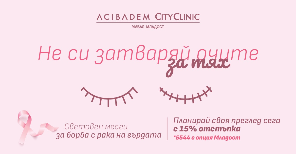 По случай Световния месец за борба с рака на гърдата - октомври, Аджибадем Сити Клиник УМБАЛ Младост предоставя 15% отсъпка на всички образни изследвания на гърди - стандартна и 3D мамография, ехографско изследване и ядрено магнитен резонанс на млечни жлези. Пациентите могат да планират своя преглед на *5544 с опция Младост.