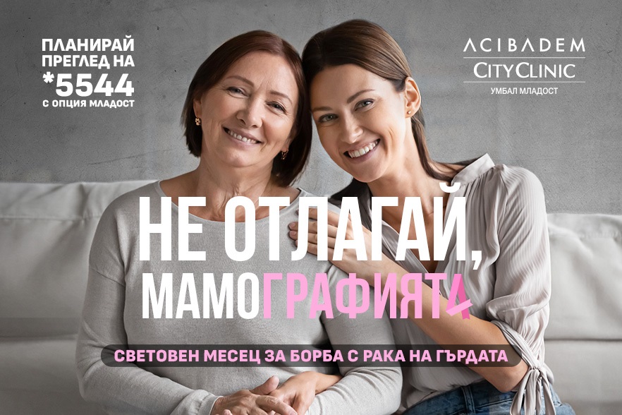 По случай Световния месец за борба с рака на гърдата - октомври, Аджибадем Сити Клиник УМБАЛ Младост предоставя 15% отстъпка на всички образни изследвания на гърди - стандартна и 3D мамография, ехографско изследване и ядрено магнитен резонанс на млечни жлези. Пациентите могат да планират своя преглед на *5544 с опция Младост.
