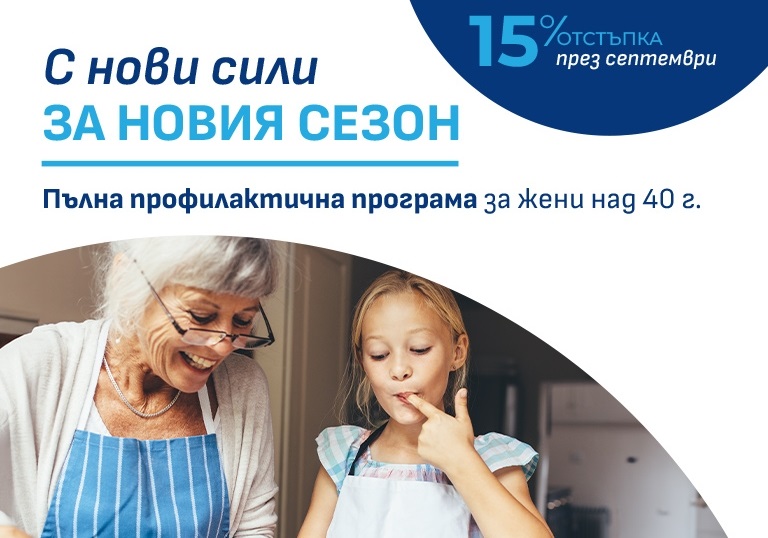 Само през септември може бързо и лесно да планирате и направите своите профилактични прегледи в Центъра за профилактика на здравето в "Acibаdem City Clinic УМБАЛ Младост" с 15% отстъпка от стандартните цени. Можете да избирате между стандартни или разширени пакети.