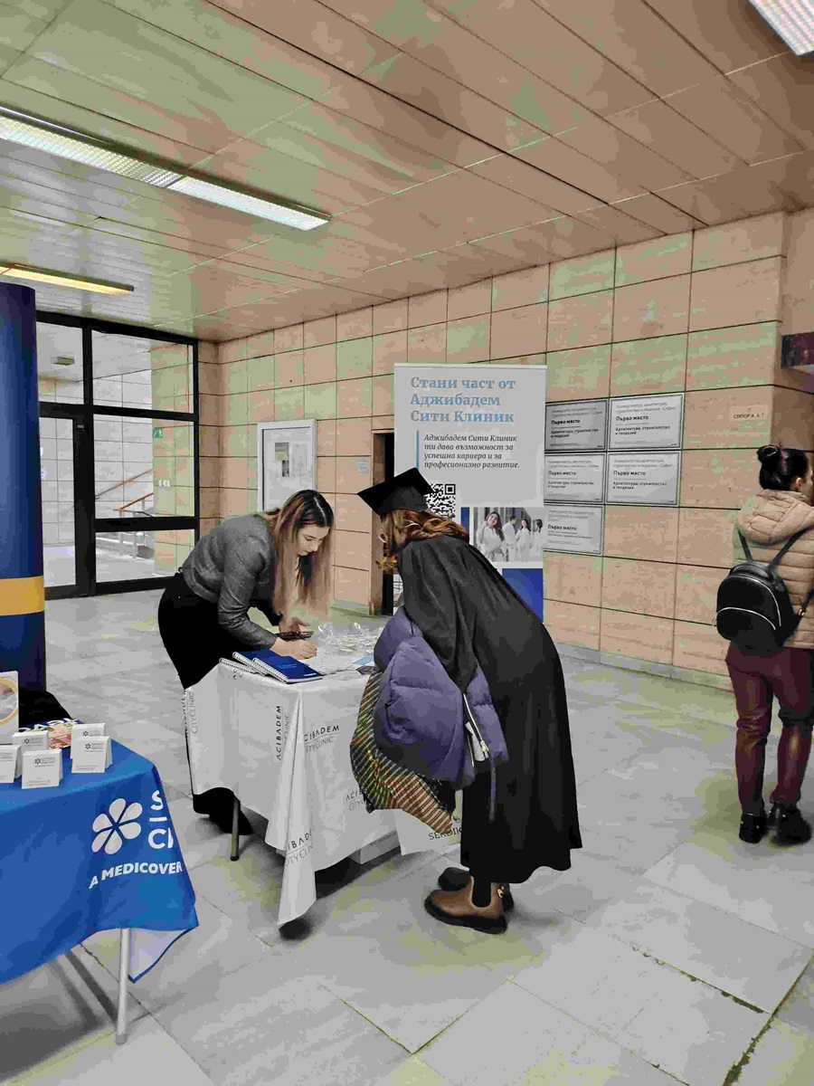 Екип от „Човешки ресурси“, представен от Мюжгян Хасан – Обучаваща медицинска сестра и Велика Василева – Експерт подбор на персонал, разположи специален информационен щанд на входа на залата. По време на церемонията те се срещнаха с абсолвентите, като отговаряха на въпросите им и ги запознаваха с възможностите за професионална реализация в Аджибадем Сити Клиник. Сред темите на разговорите бяха разнообразните програми за професионално развитие, които предлага Аджибадем Сити Клиник. Условията за работа в болниците от групата, както и възможностите за следдипломни квалификации, и кариерно развитие в здравния сектор. По време на срещите с абсолвентите, мнозина споделиха, че са готови да започнат своето професионално развитие в сферата на здравеопазването и някои от тях вече са избрали Аджибадем Сити Клиник за начало на своята кариера. Други изразиха интерес да научат повече за нашата организация и наличните позиции.