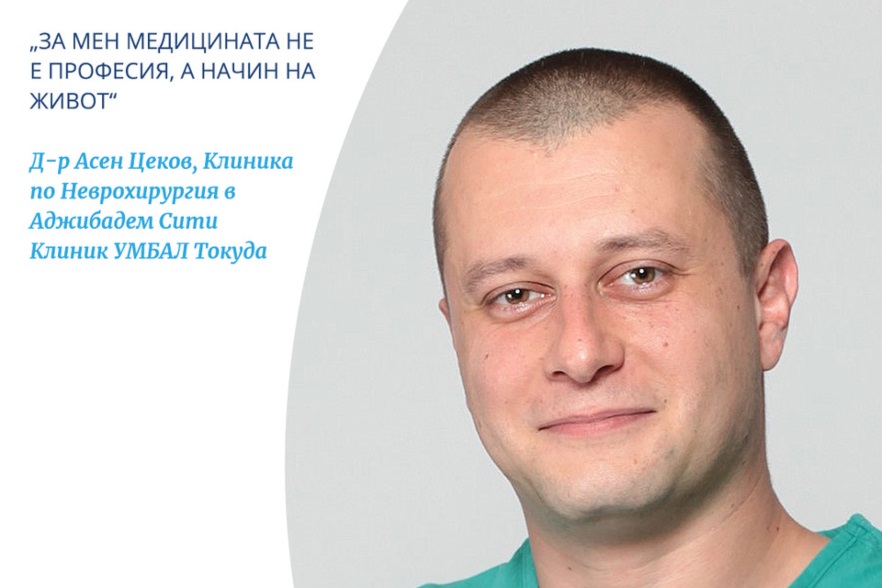 Д-р Асен Цеков е специалист в Клиниката по Неврохирургия на Аджибадем Сити Клиник УМБАЛ Токуда. Той е един от примерите в екипа на лечебното заведение, който доказва, че въпреки тежката задача - ежедневно да спасява човеши животи, като лекар, има голямо сърце, искрена и чиста душа.