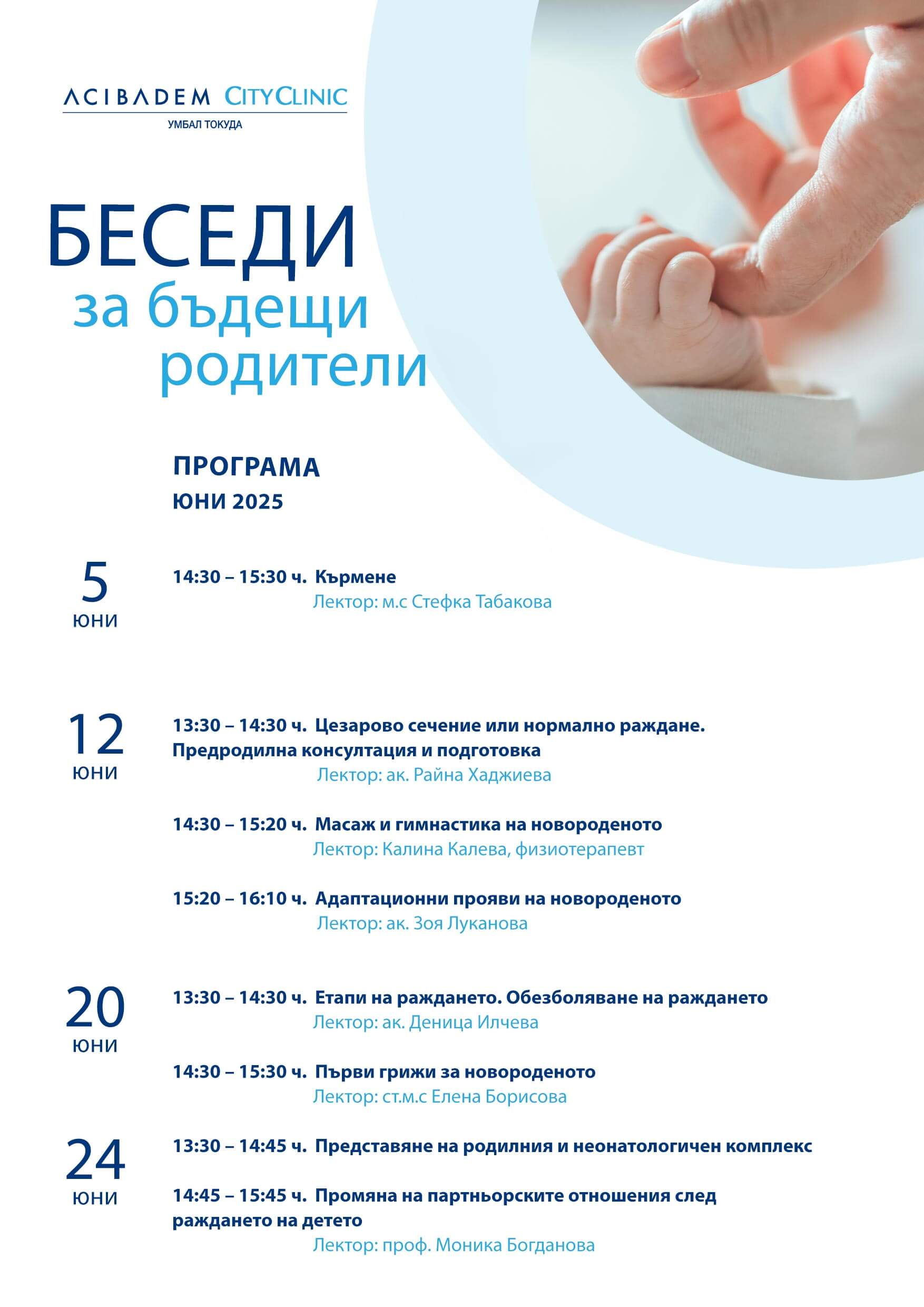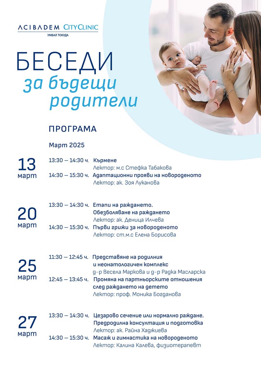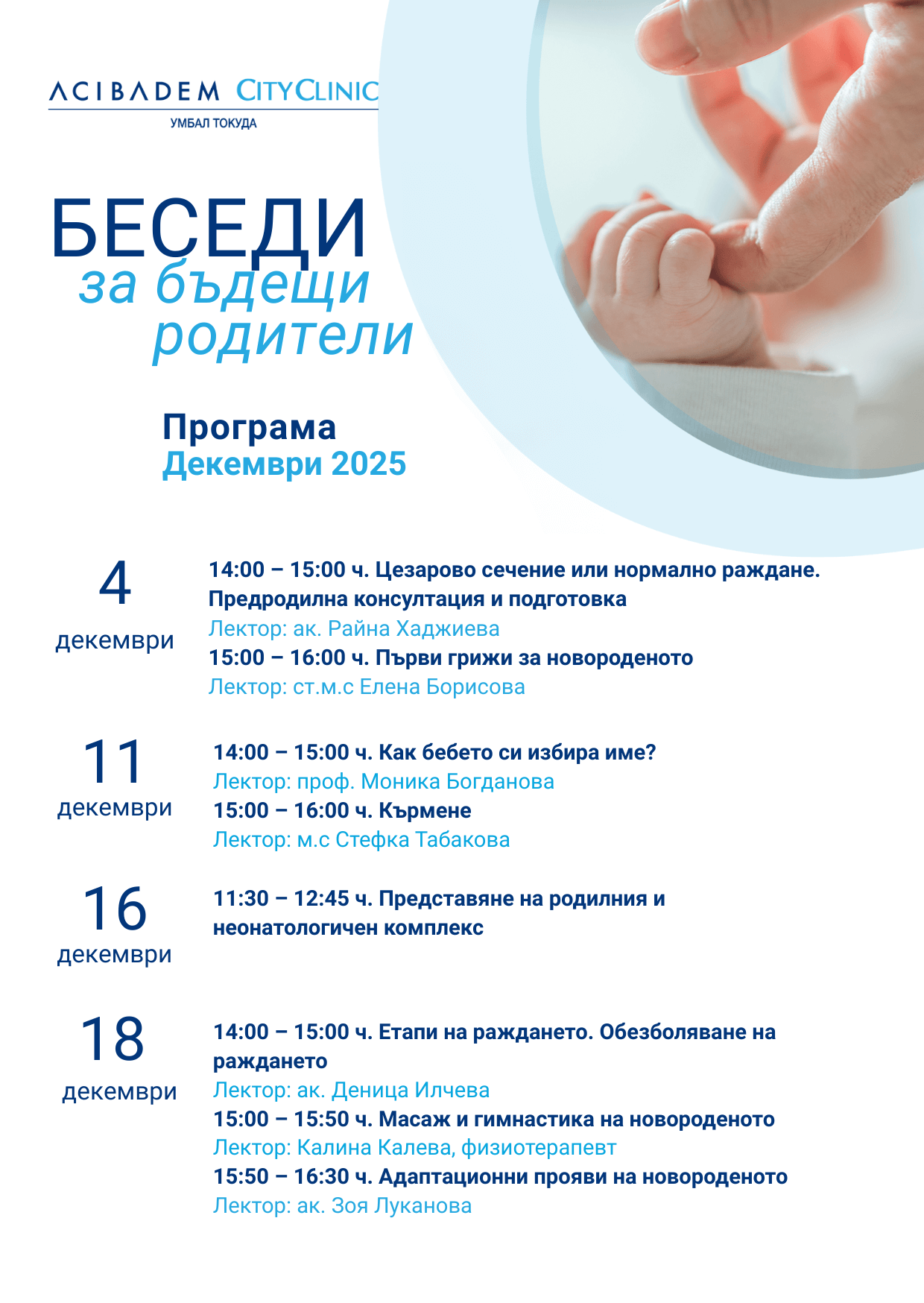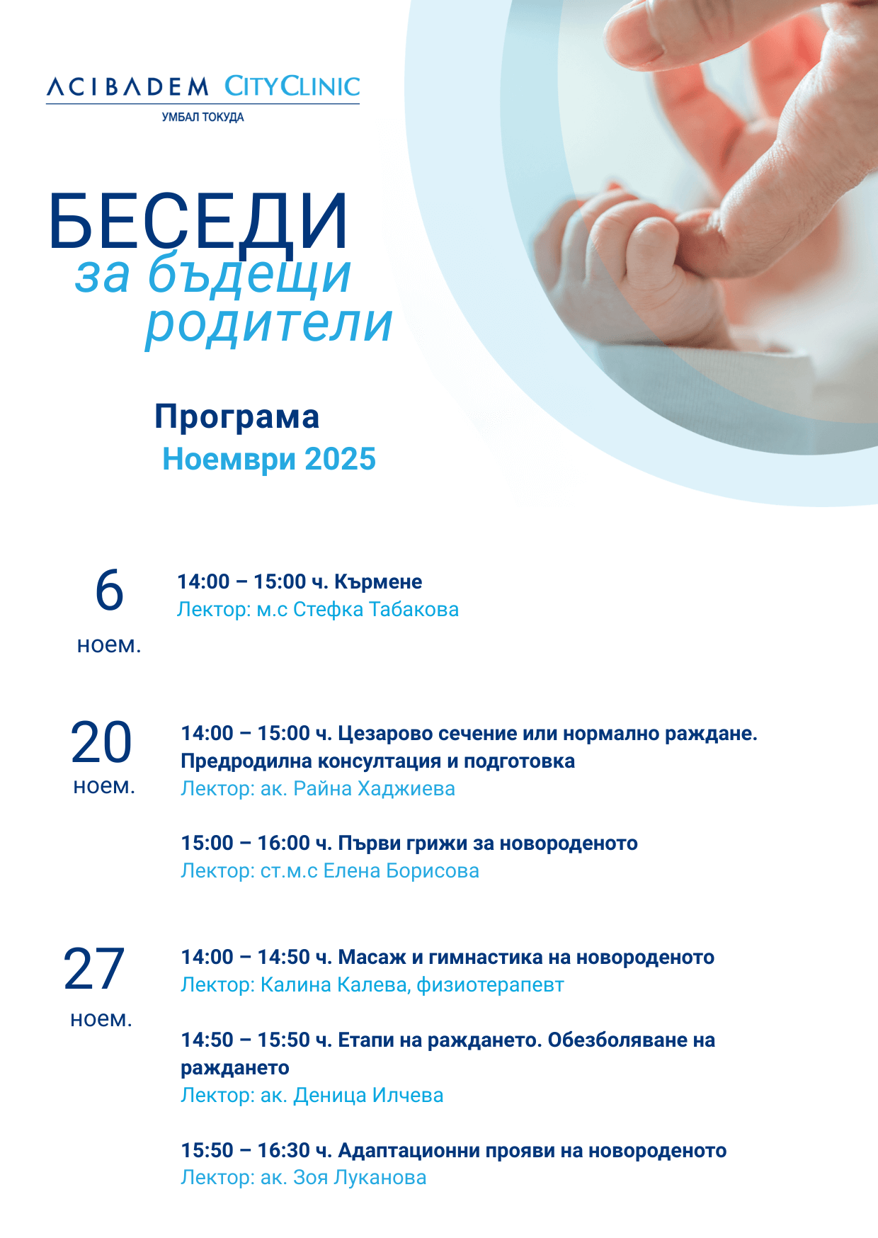 *Всички събития се провеждат в Аулата на етаж 9 на Аджибадем Сити Клиник УМБАЛ Токуда. Не е необходимо предварително записване.