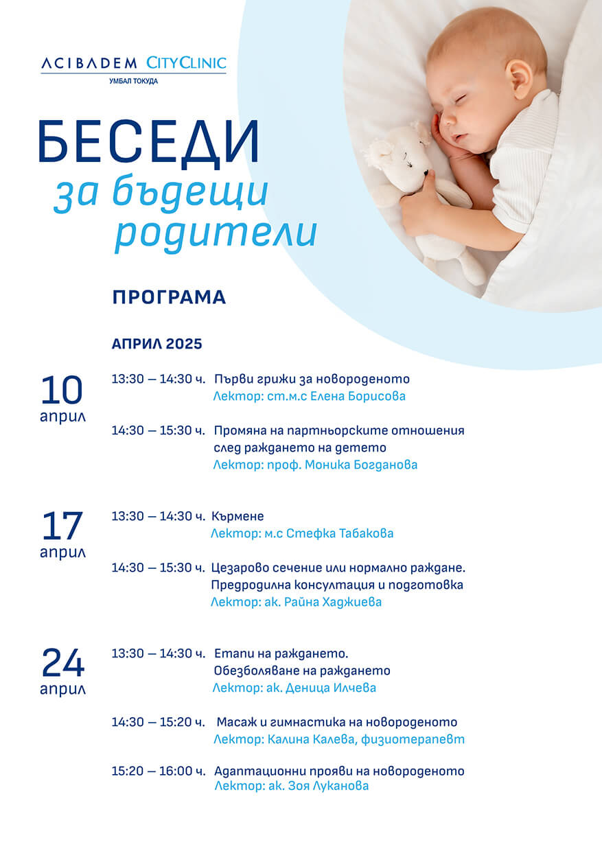 По време на беседите нашите специалисти ще ви предоставят важна информация за проследяването на бременността, раждането, първите грижи за новороденото, кърменето, масажът и гимнастиката на бебетата. Също така как се променят партньорските отношения след появата на бебето и как успешно да изпълняваме родителската и съпружеската роля.