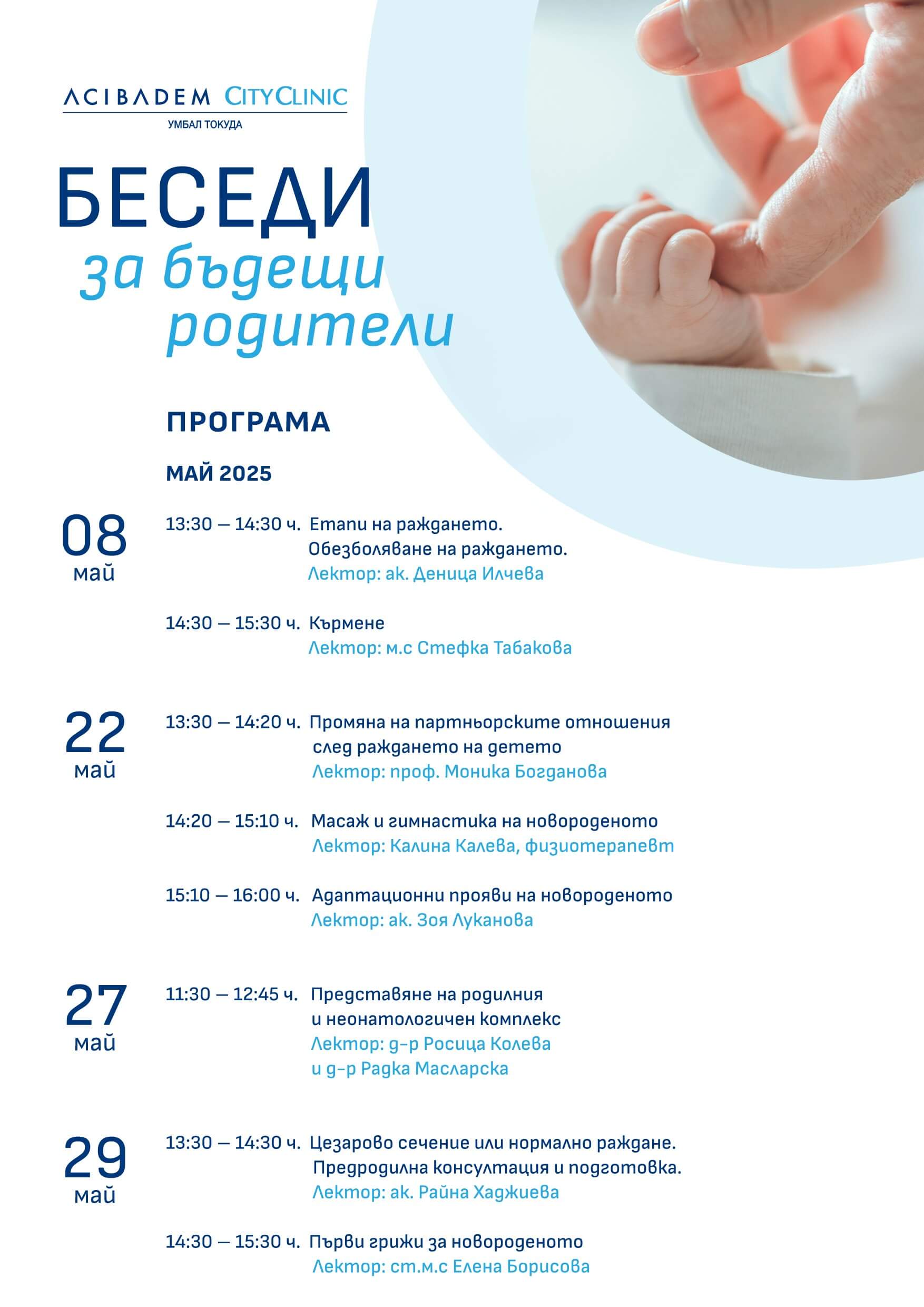 В Аджибадем Сити Клиник УМБАЛ Токуда има изградена напълно безплатна програма за обучение както на бъдещите майки, така и на бъдещите татковци. Лектори са нашите опитни медицински специалисти от Клиниката по акушерство и гинекология, Отделението по неонатология и Центъра по клинична психология и психосоматика.