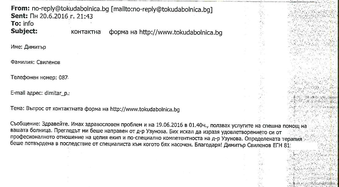 "Бих искал да изразя удовлетворението си от професионалното отношение на целия екип на Спешна помощ и по-специално компетентността на д-р Узунова"