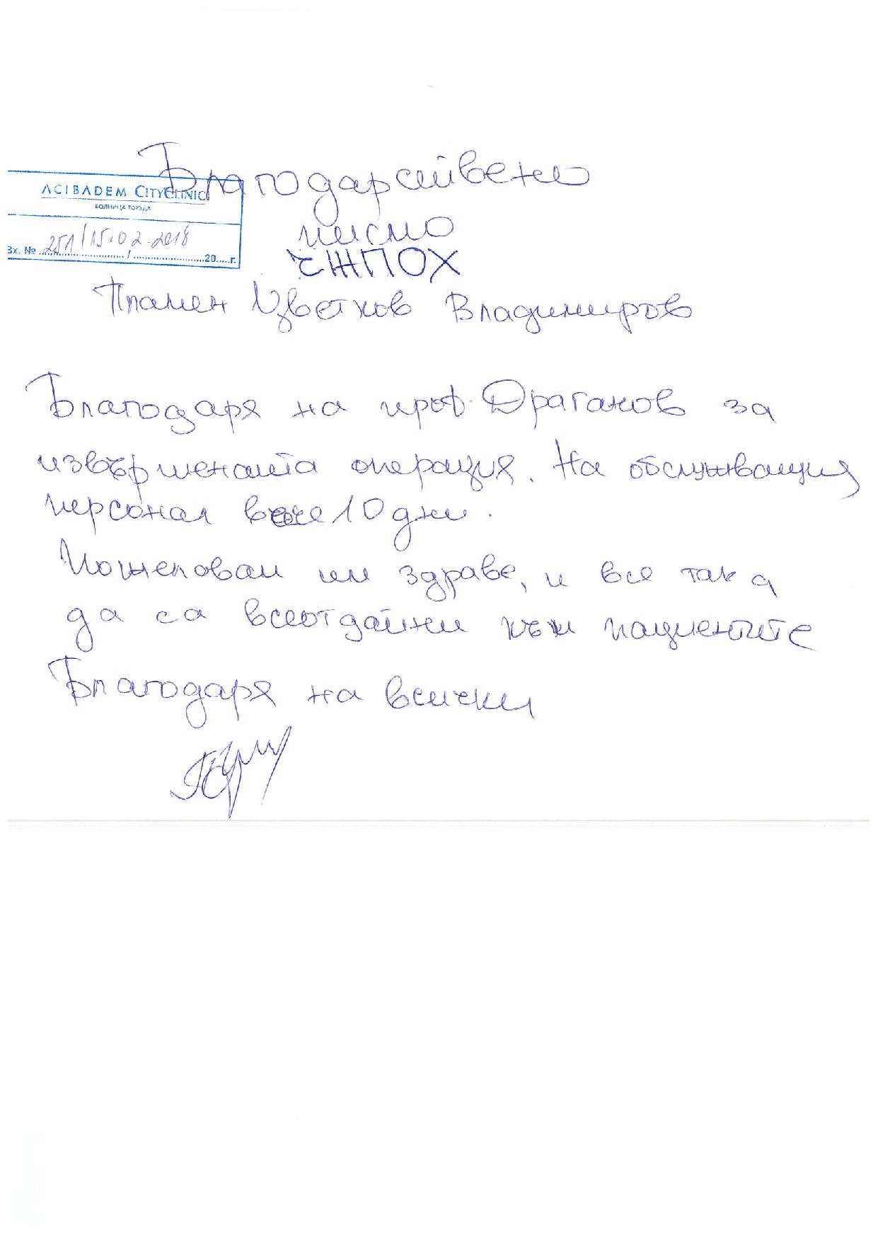 "Благодаря на проф. Драганов за извършената операция и на обслужващия персонал"