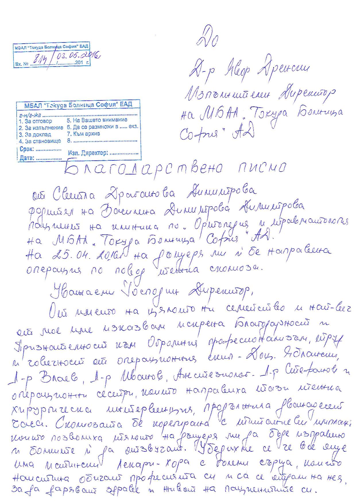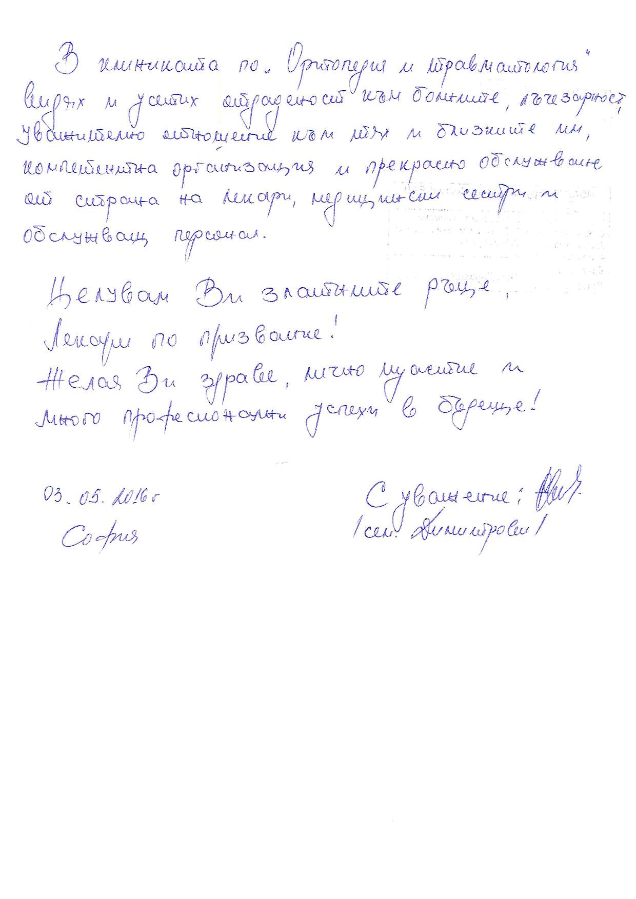 "От името на цялото ни семейство и най-вече от мое име изказвам искрена благодарност и признателност към огромния професионализъм, труд и човечност на операционния екип - д-р Яблански, д-р Влаев, д-р Иванов.."