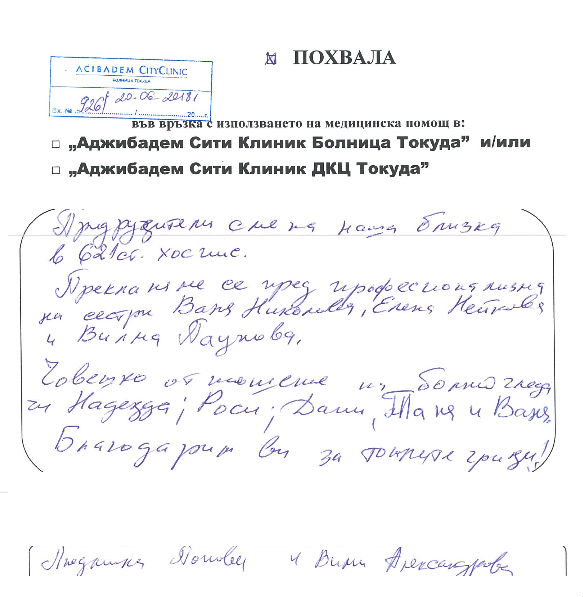 "Прекланяме се пред професионализма на сестри Ваня Николова, Елена Нейкова и Вилма Паунова от Аджибадем Сити Клиник Хоспис. Човешко отношение на болногледачи Надежда, Роси, Дани, Таня и Ваня"