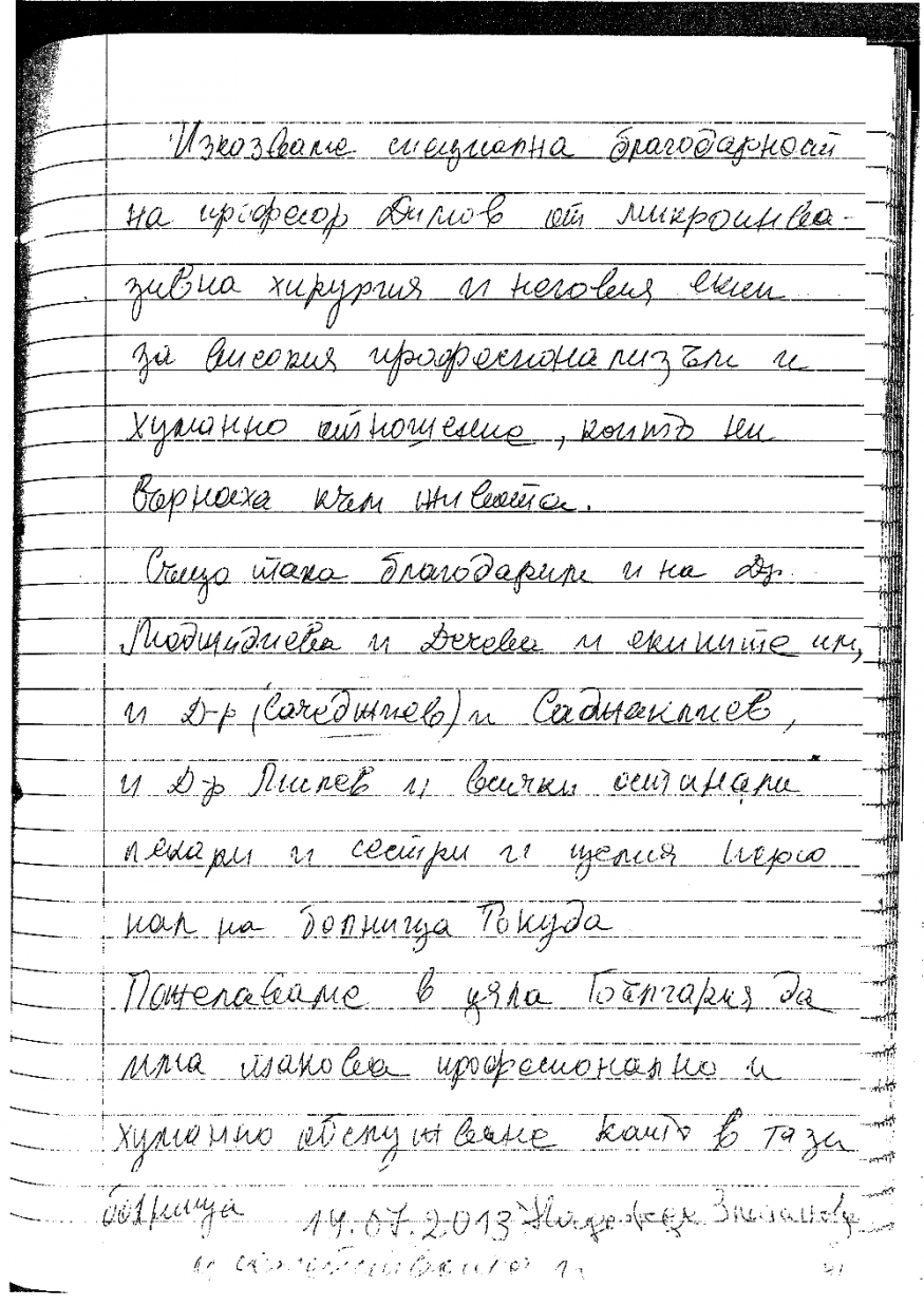"Специална благодарност на проф. Димов и неговия екип за високия професионализъм и хуманно отношение и на всички останали лекари и сестри на болница Токуда"