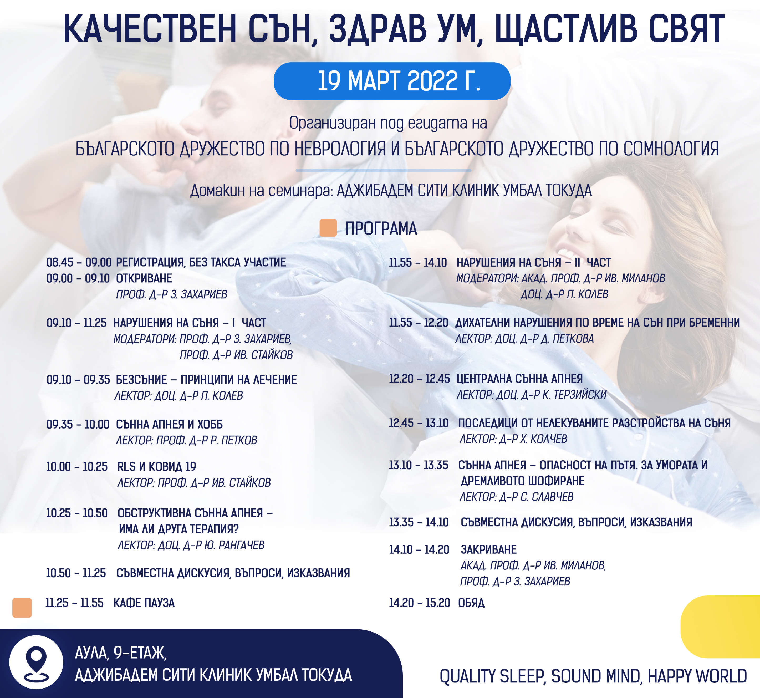 Българското дружество по неврология и Българското дружество по сомнология организира за четвърти пореден път научно-практически семинар на тема "Качествен сън, здрав ум, щастлив свят". Събитието се проведе на 19.03.22 г. и бе посветено на Световния ден на съня. Домакин на хибридното събитие е Аджибадем Сити Клиник УМБАЛ Токуда.