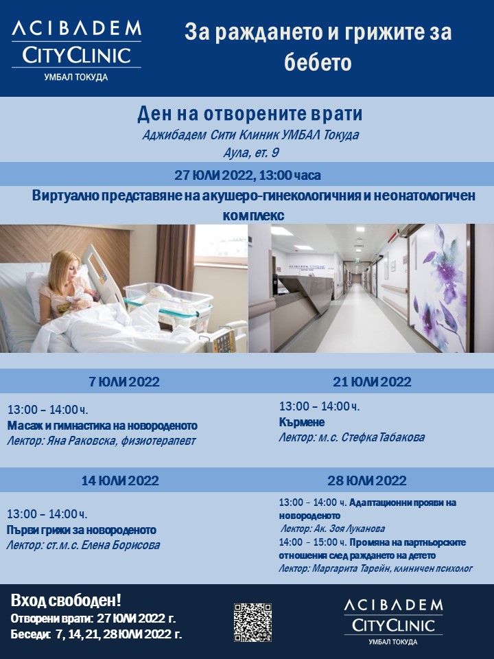 Аджибадем Сити Клиник УМБАЛ Токуда подновява провеждането на Деня на отворените врати и беседите за бъдещи родители от месец юли 2022 г. Всички събития ще се състоят в аулата на 9-я етаж на болницата.