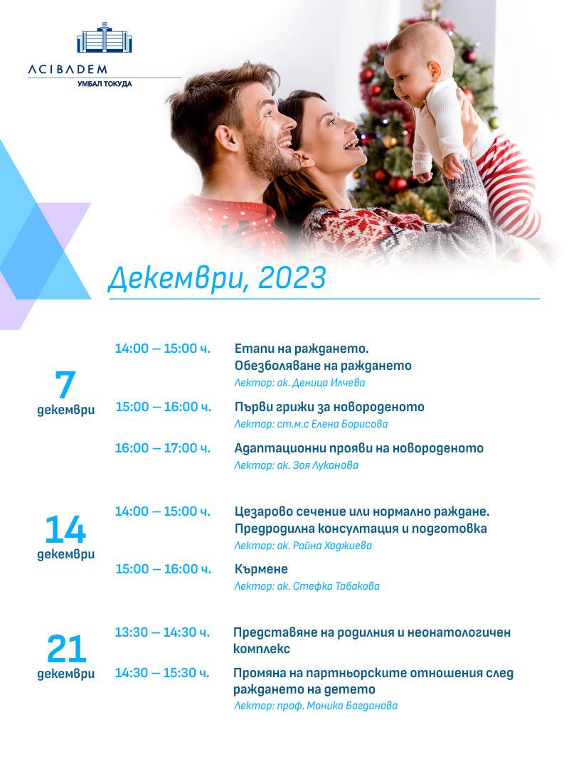 На 7 декември, четвъртък, от 14 часа, започва безплатната програма от Беседи за бъдещи родители на Аджибадем Сити Клиник УМБАЛ Токуда за месеца. Всички събития ще се проведат в Аулата на етаж 9 на болницата, като не е необходимо предварително записване.
