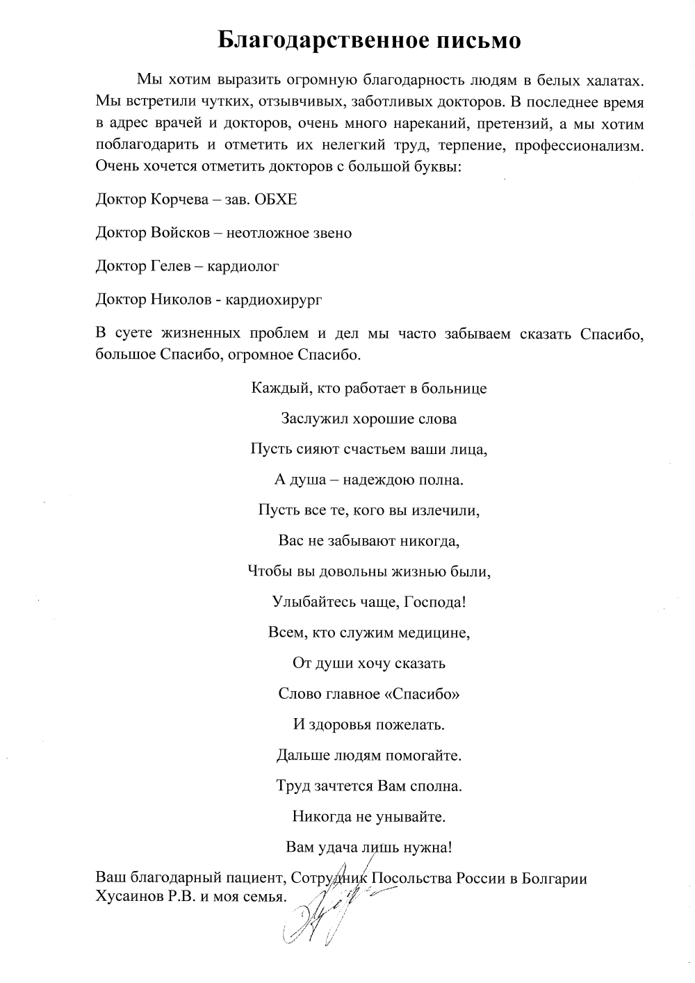 Благодарствено писмо на пациент от Посолството на Русия в България