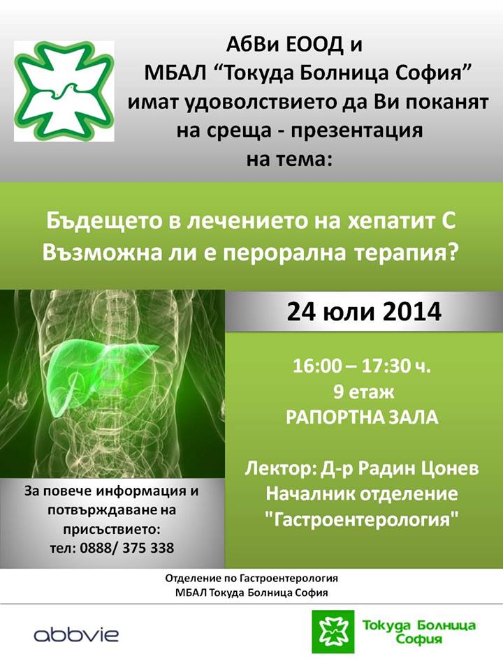 Бъдещето в лечението на хепатит С - тема на лекция в Токуда Болница на 24 юли 2014 от 16:00 – 17:30 ч. на 9 етаж в Конферентна зала. Лектор: Д-р Радин Цонев, Началник отделение "Гастроентерология".