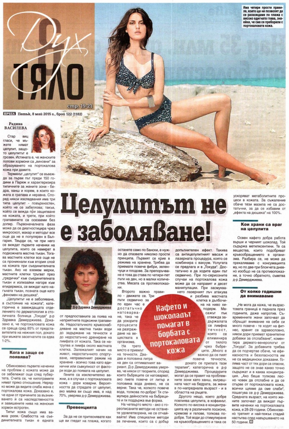 Д-р Здравка Демерджиева, началник отделение "Дерматология и венерология" в Токуда Болница София отговаря на въпроси за целулита, причините и превенцията му в рубрика Дух и Тяло във в. Преса: