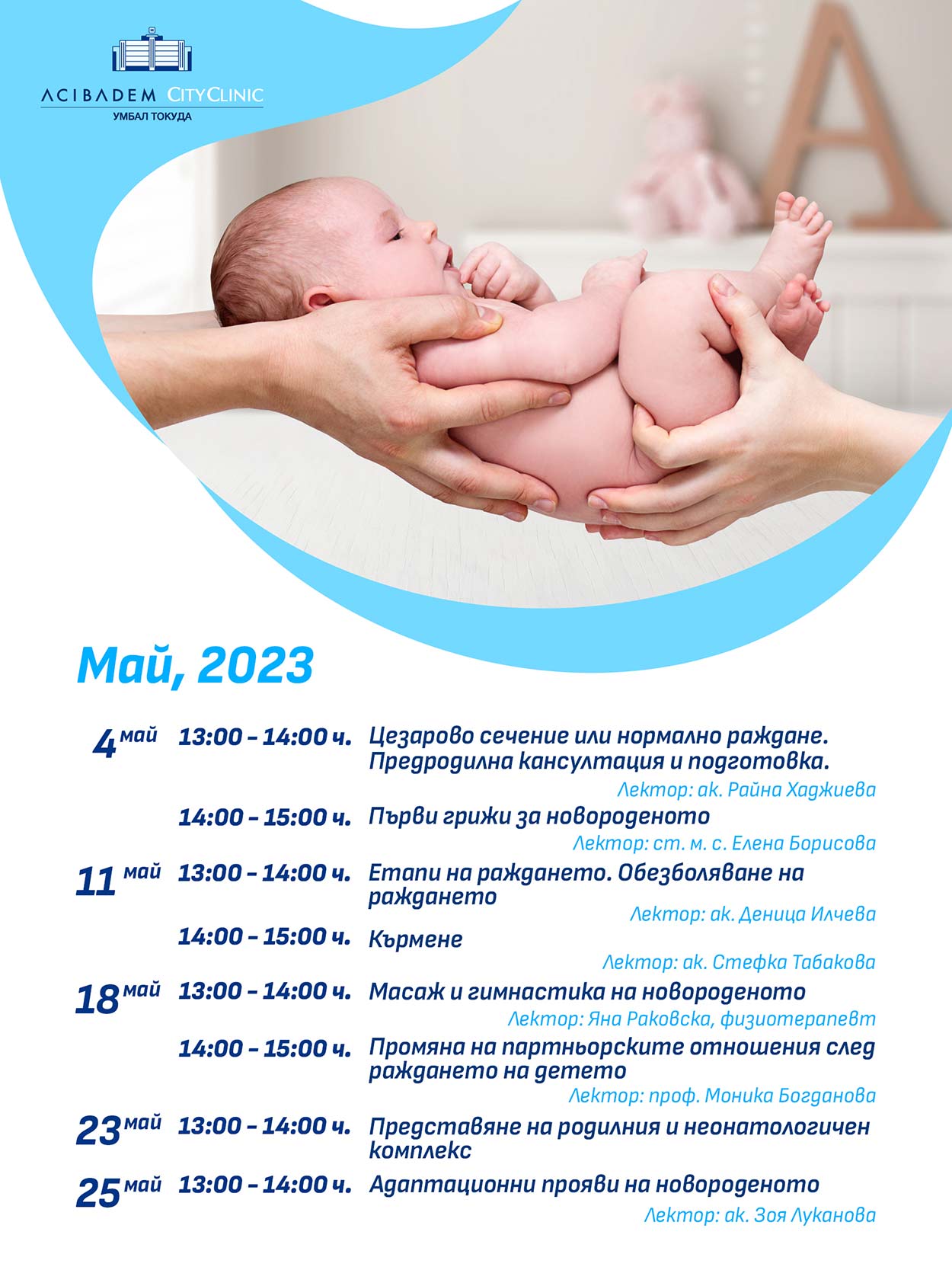 Всички събития ще се проведат в Аулата на етаж 9 на болницата, като не е необходимо предварително записване. Лекциите се водят от нашите медицински специалисти от Клиниката по акушерство и гинекология, Отделението по неонатология и Центъра по клинична психология и психосоматика.