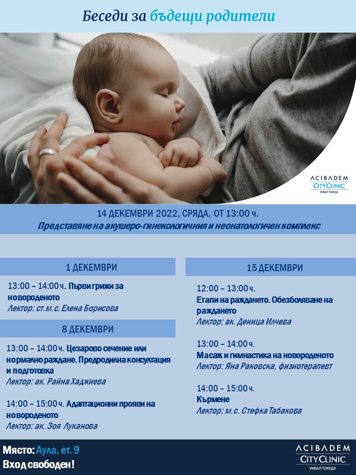 По време на беседите, които ще се проведат на 1, 8 и 15 декември, нашите специалисти ще обърнат внимание на всички важни аспекти от проследяването на бременността, раждането, първите грижи за новороденото и адаптацията му, кърменето, масажът и гимнастиката на бебетата.