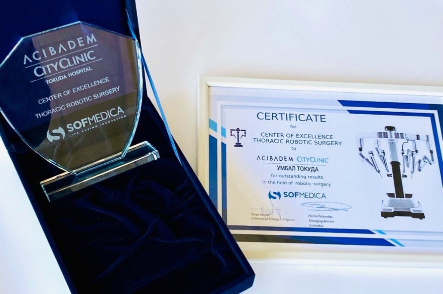 Аджибадем Сити Клиник УМБАЛ Токуда получи престижното отличие “Център за върхови постижения в областта на гръдната хирургия” (Center of Excellence) от Софмедика България – представител на роботизираната хирургична система Да Винчи. На церемония в лечебното заведение бяха връчени сертификат и плакет от Петя Арсова – търговски директор на Софмедика на д-р Венелина Милева – изпълнителен директор на болницата и на доц. Минчев – началник на отделение по Гръдна хирургия в лечебното заведение. Христо Стоев – мениджър капиталови продажби и Александър Бояджиев – мениджър клинични продажби, лично поздравиха доц. Минчев за големия му принос за развитието на този минимално инвазивен оперативен метод.