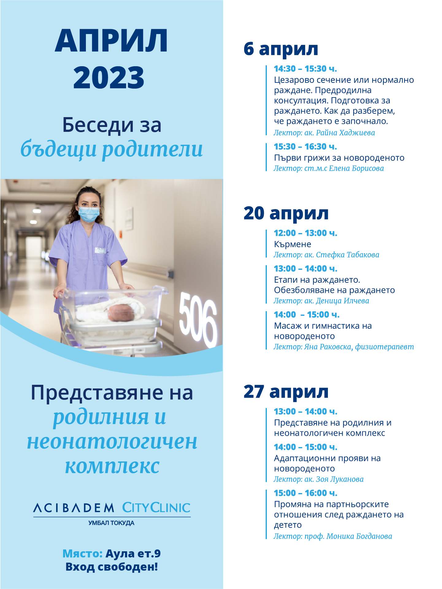 Преминете спокойни по пътя към родителството и уверени в себе си поемете грижите за своето бебе с нашата безплатна програма за обучение на бъдещи родители. Беседите започват на 6 април от 14:30 часа. Всички събития се провеждат в Аулата на етаж 9 на Аджибадем Сити Клиник УМБАЛ Токуда, като не е необходимо предварително записване.