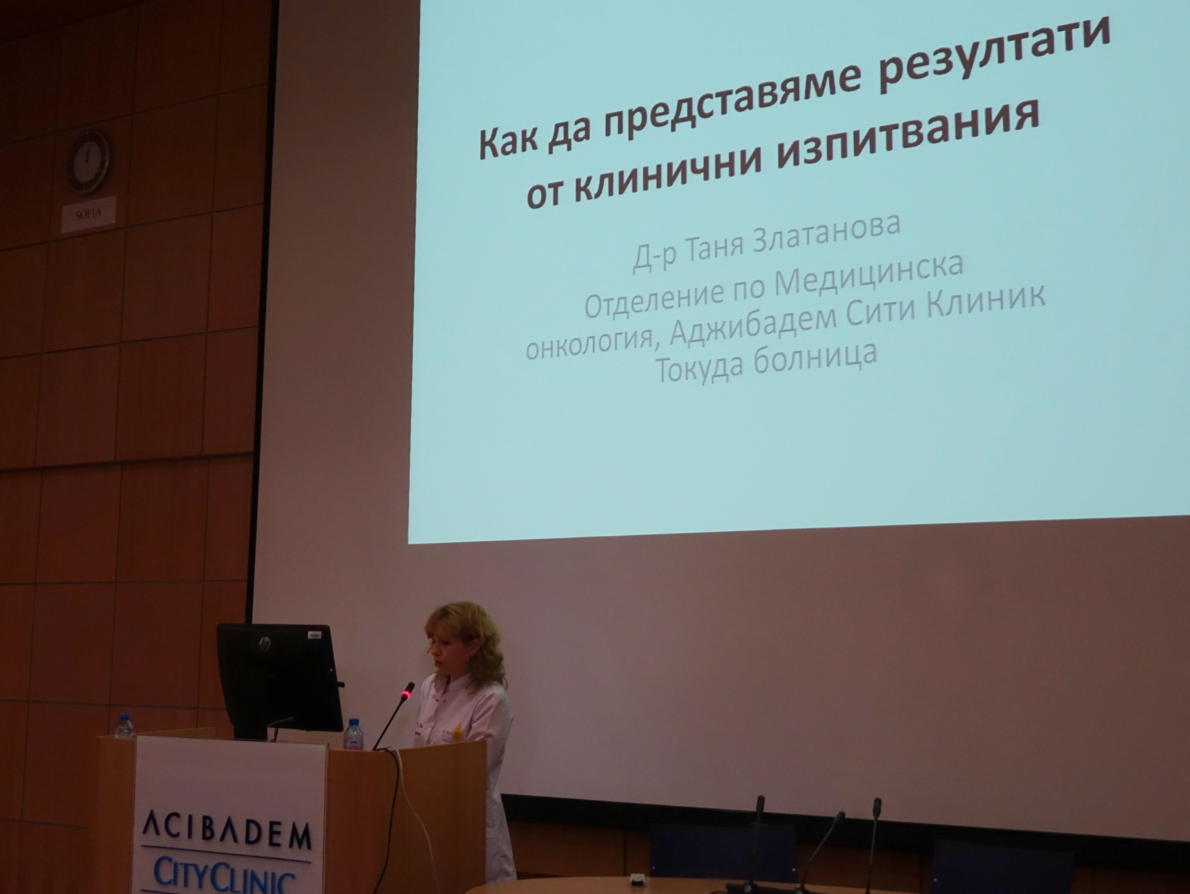 Д-р Таня Златанова от Отделението по Медицинска онкология представи пред аудиторията лекция за правилното интерпретиране резултатите от клиничните изпитвания. На тази тема бяха и двете практически части в програмата (по типа workshop), в който се включиха участниците в обучението.