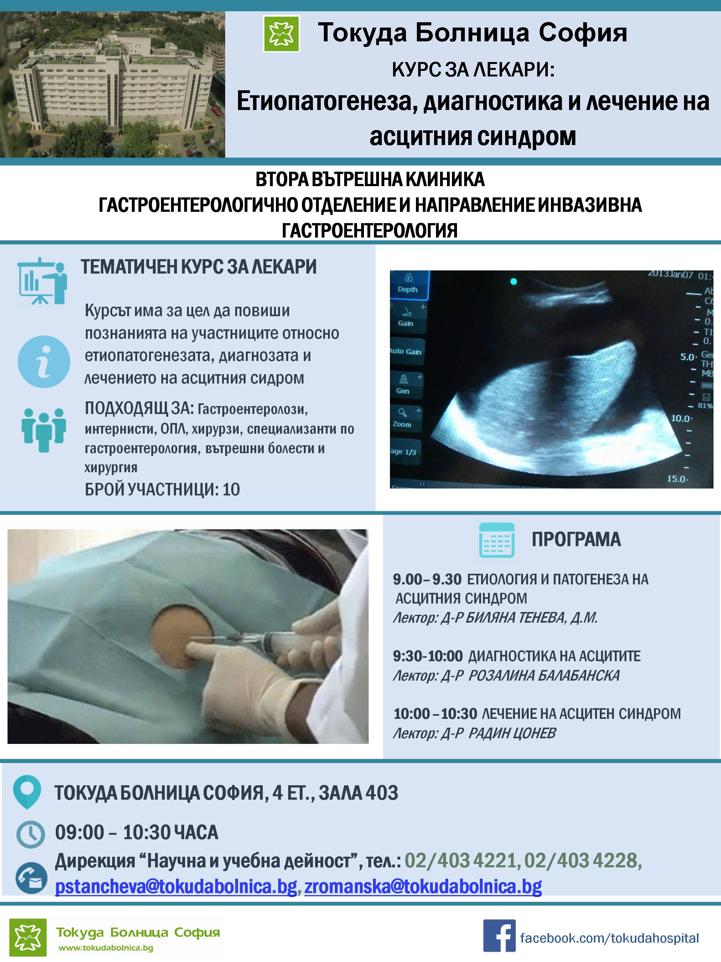 Отделението по Гастроентерология на Втора вътрешна клиника в Токуда организира курс за лекари по темата за асцитния синдром. Обучението ще се проведе на 30 октомври от 09:00 часа в зала 403 на 4-ти етаж. Курсът е подходящ за гастроентеролози, интернисти, хирурзи, ОПЛ, специализанти по гастроентерология, вътрешни болести и хирургия. Лектори ще бъдат д-р Радин Цонев, началник на отделение по Гастроентерология в Токуда Болница София, д-р Розалина Балабанска и д-р Биляна Тенева от същото отделение. Желаещите могат да се запишат за участие в Дирекция Научна и учебна дейност на Токуда Болница София, тел.: 02/403 4221, 02/403 4228, както и на имейл адреси: zromanska@tokudabolnica.bg и pstancheva@tokudabolnica.bg