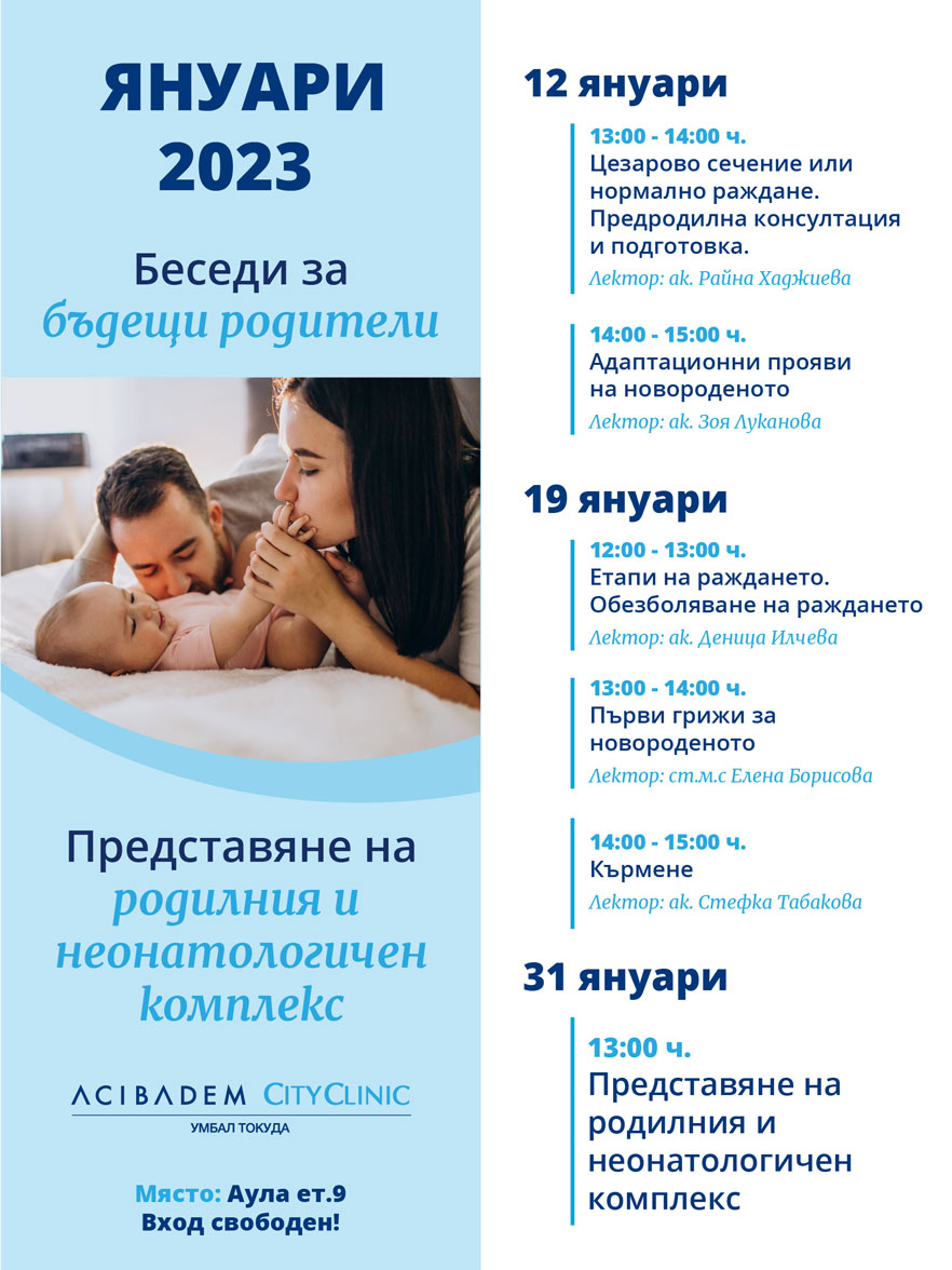 Обученията за бъдещи родители на Аджибадем Сити Клиник УМБАЛ Токуда продължават през новата 2023 г. Заповядайте на представянето на родилния и неонатологичен комплекс и беседите за бъдещи родители през януари, за да се подготвите за всички важни аспекти от бременността, раждането и грижите за бебето.