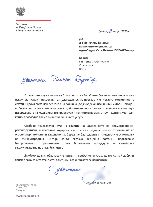 Посолството на Република Полша в България изрази искрена благодарност към лекарите, медицинските сестри и целия персонал на Аджибадем Сити Клиник УМБАЛ Токуда за проявения висок професионализъм при извършването на медицинските процедури, доброжелателността и топлото отношение към служителите на посолството.
