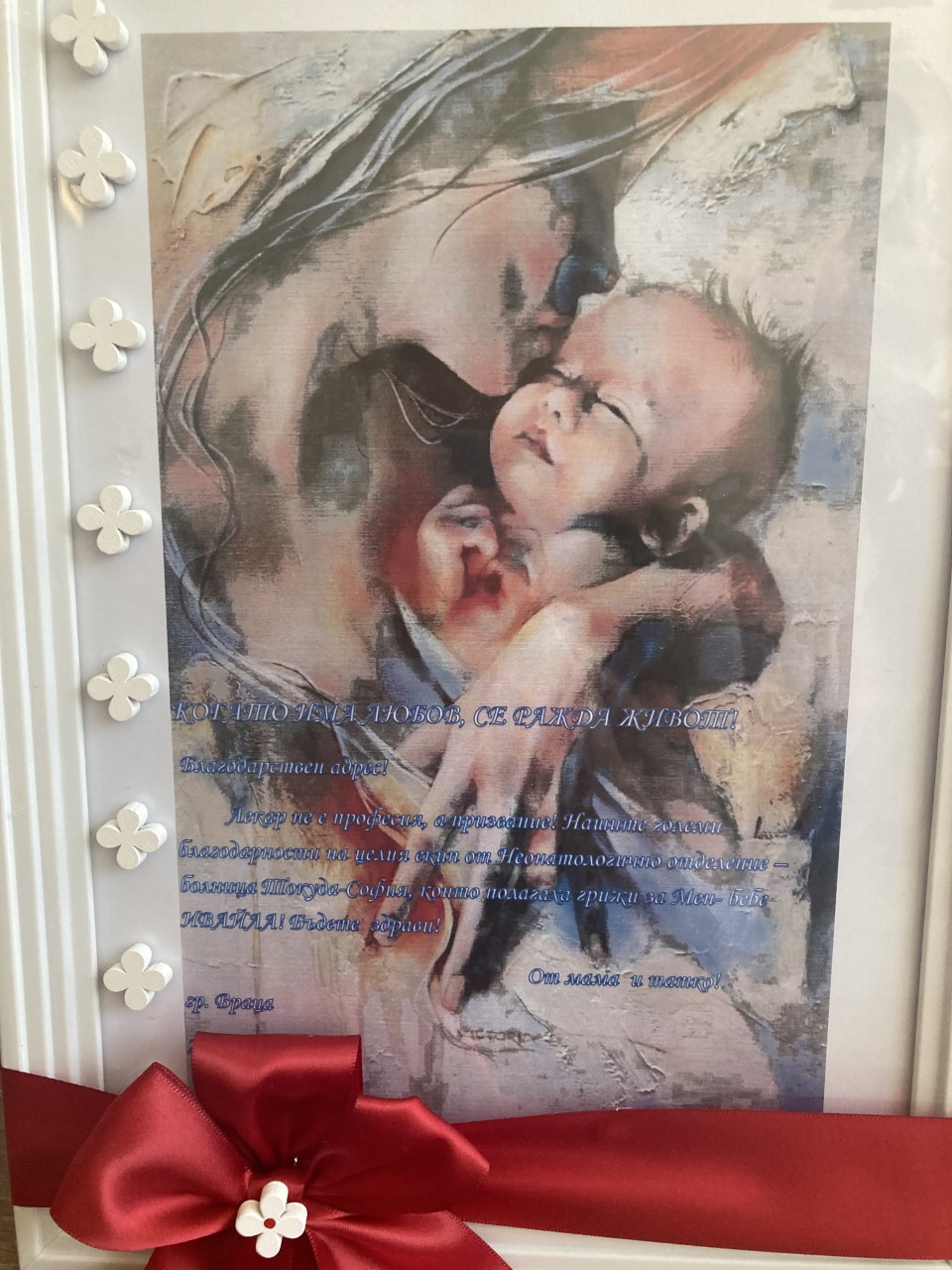 "Лекар не е професия, а призвание. Нашите големи благодарности на целия екип от Неонатологично отделение - болница Токуда - София, които полагаха грижи за мен - бебе Ивайла! Бъдете здрави!", пишат гордите родители в благодарствен адрес към екипа от високоспециализирани специалисти на болницата.