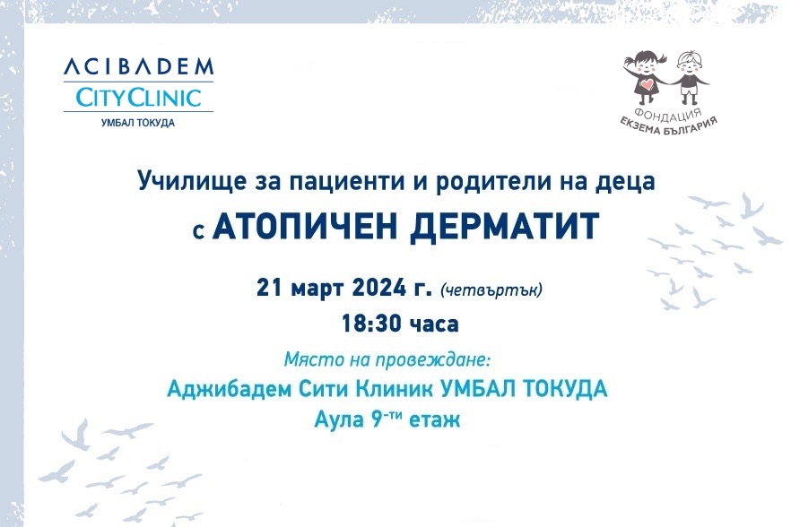 Училище за пациенти и родители на деца с атопичен дерматит ще се проведе в Аджибадем Сити Клиник УМБАЛ Токуда на 21 март, четвъртък. Събитието, организирано от Клиниката по дерматология и венерология и Фондация Екзема България, ще се състои от 18:30 часа в Аула „Токуда“ на етаж 9.