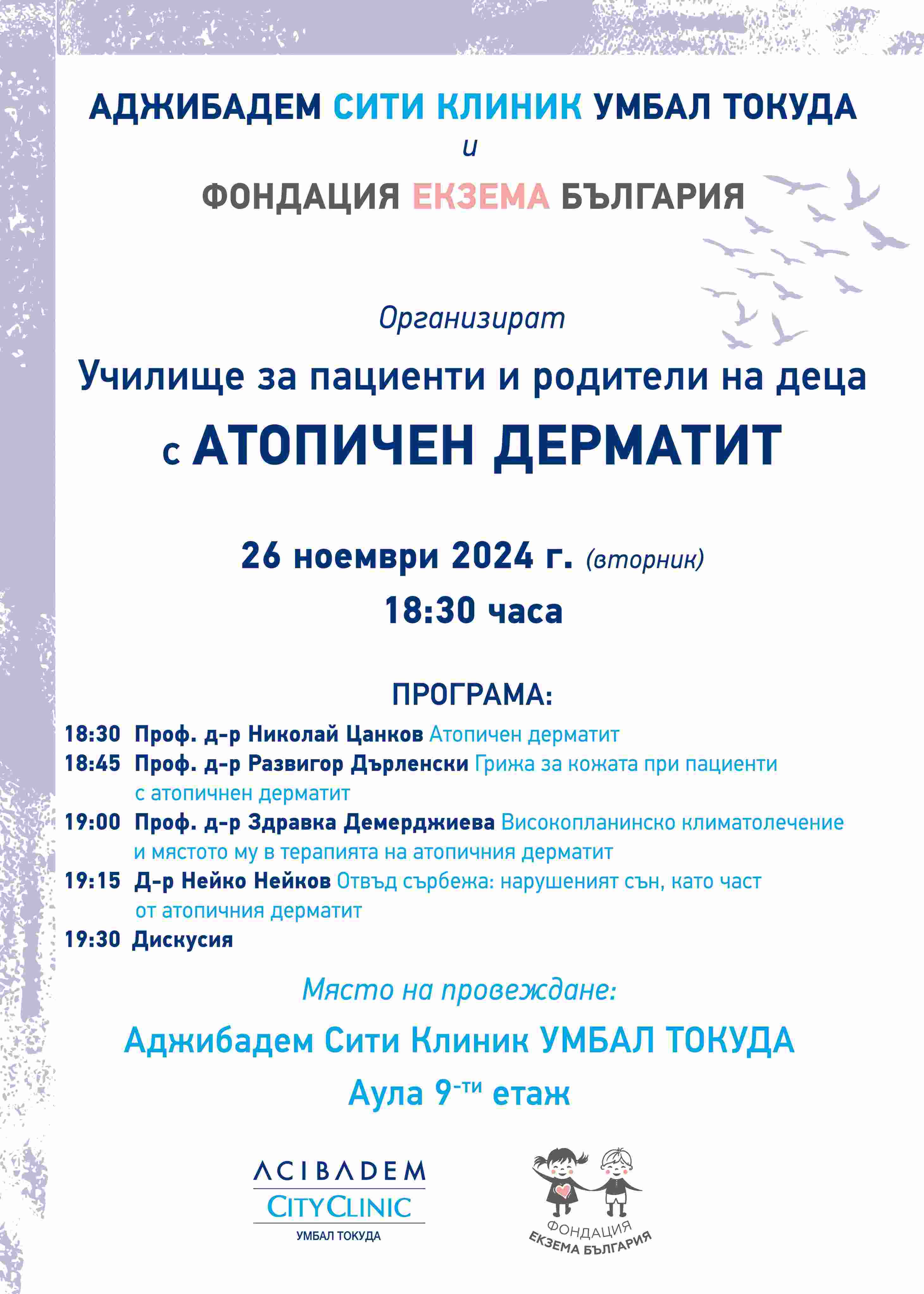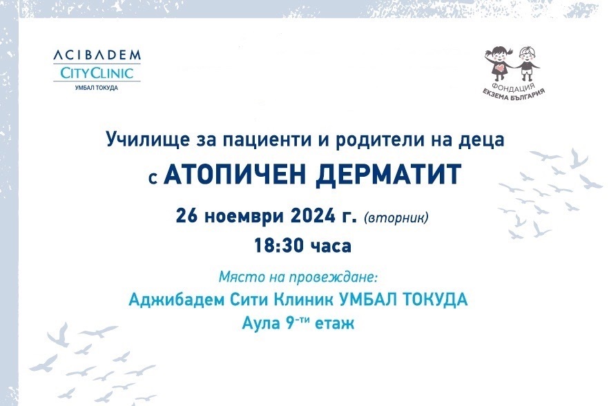 Училище за пациенти и родители на деца с атопичен дерматит ще се проведе в Аджибадем Сити Клиник УМБАЛ Токуда на 26 ноември, вторник. Събитието, организирано от Клиниката по дерматология и венерология и Фондация „Екзема България“ , ще се състои от 18:30 часа в Аула „Токуда“ на етаж 9.