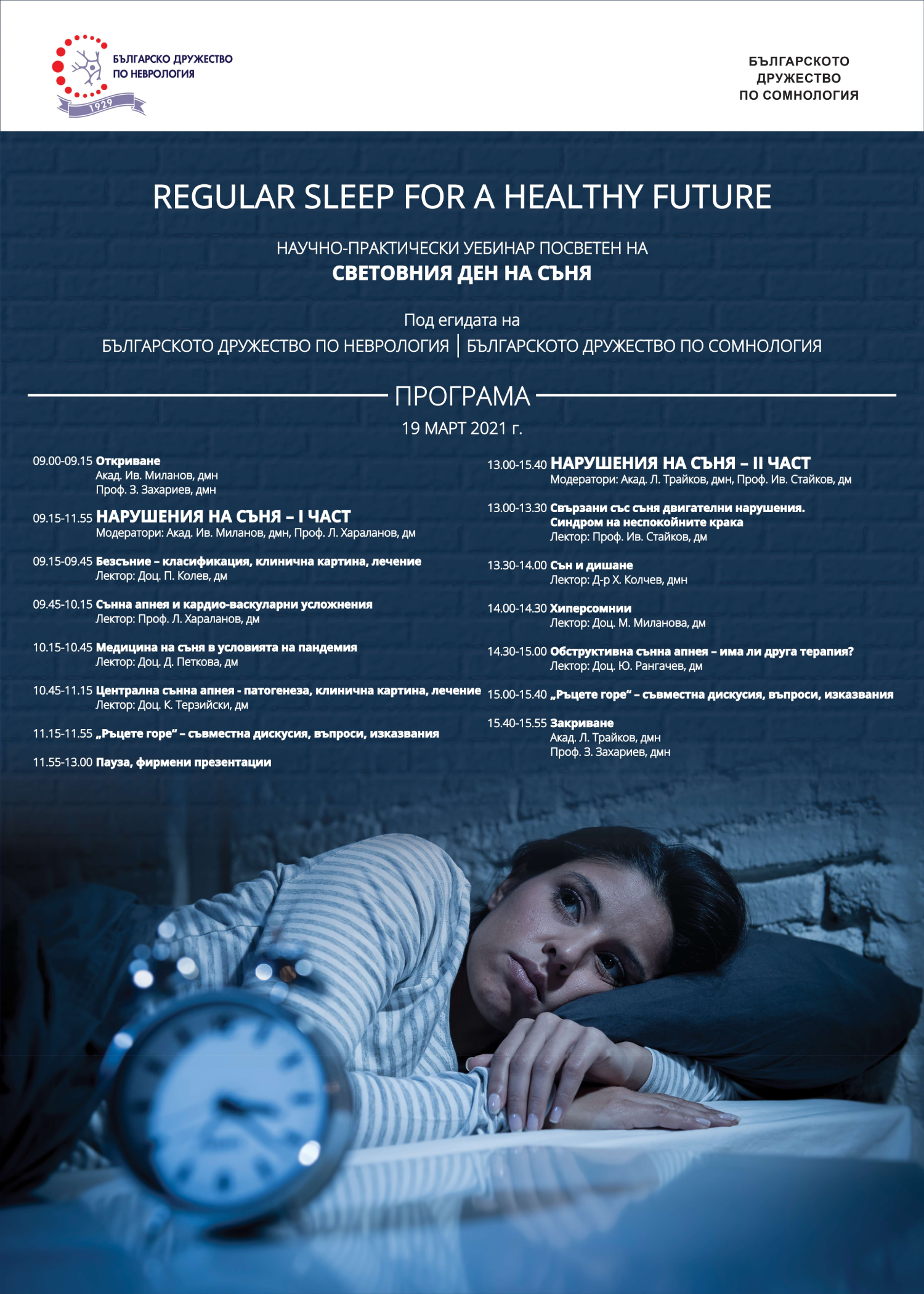 По повод Световния ден на съня- 19 март ще се проведе специализиран уебинар на тема “REGULAR SLEEP FOR A HEALTHY FUTURE” с участието на проф. Иван Стайков, началник на Клиника по Неврология и Медицина на съня в Аджибадем Сити Клиник Болница Токуда.