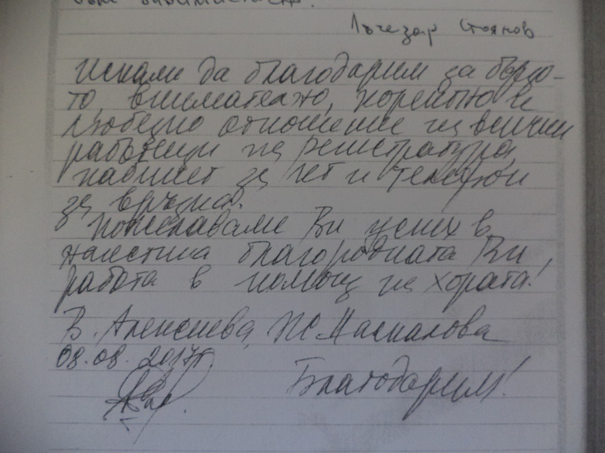 Искаме да благодарим за бързото, внимателно, коректно и любезно отношение на всички работещи на регистратура, кабинет за Компютърна томография и телефонния център. Пожелаваме ви успех в наистина благородната ви работа в помощ на хората! Благодарим! - В.Алексиева, Ж. Даскалова